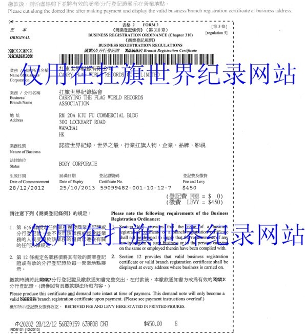 三、奇尼斯世界纪录协会:香港税务局的商业登记证查询: