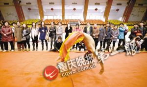 昨上午10时20分,重庆晚报记者在大足区体育馆,再次见到了龙弟豪。他正和师弟师妹们做着准备运动。有不少亲友和居民前来助阵。“就是这个小娃儿,有八块腹肌,厉害得很!”父亲龙孝奎得知儿子要挑战世界纪录,专程从广东赶回来。