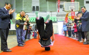 为数不多的观众群中,有一个穿着轮滑鞋的小个子男生,他就是去年11月挑战后手翻扛旗世界纪录成功的龙帝豪。他的父亲龙孝奎昨天专门带着他给赵航助威,也一起见证了大足又一个世界纪录的产生。(记者 卢雨)