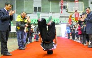为数不多的观众群中,有一个穿着轮滑鞋的小个子男生,他就是去年11月挑战后手翻扛旗世界纪录成功的龙帝豪。他的父亲龙孝奎昨天专门带着他给赵航助威,也一起见证了大足又一个世界纪录的产生。