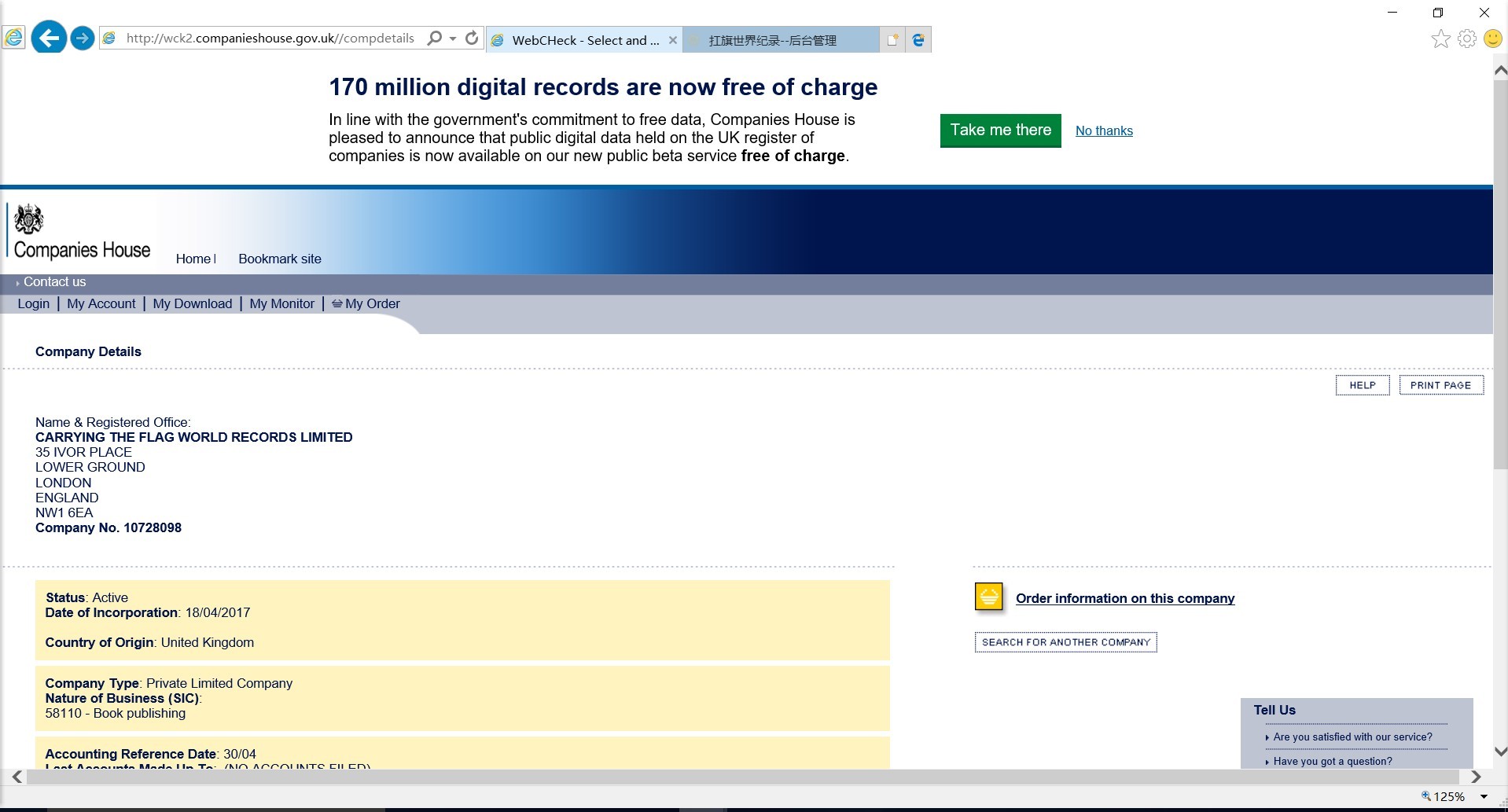 注册证真假可以到英国政府公司注册处网上查询中心网址查询:http://wck2.companieshouse.gov.uk。查询注册号时请直接输入数字10728098;或公司名称: CARRYING THE FLAG WORLD RECORDS LIMITED 查询。为更好地服务客户,CARRYING THE FLAG WORLD RECORDS LIMITED 进行了重组。