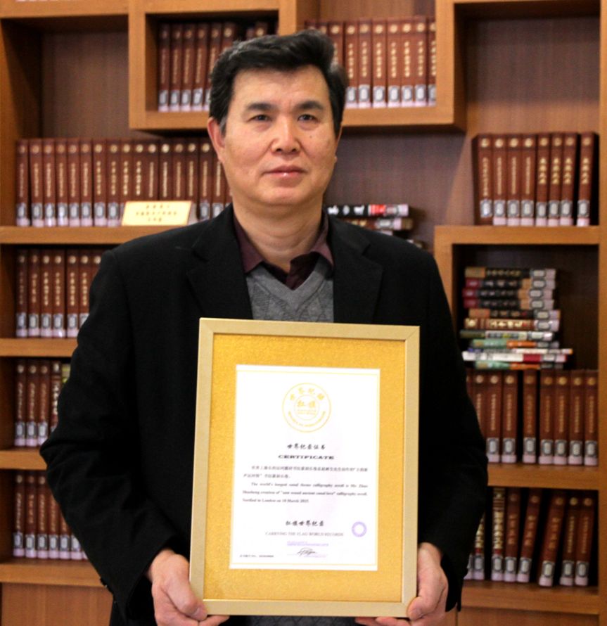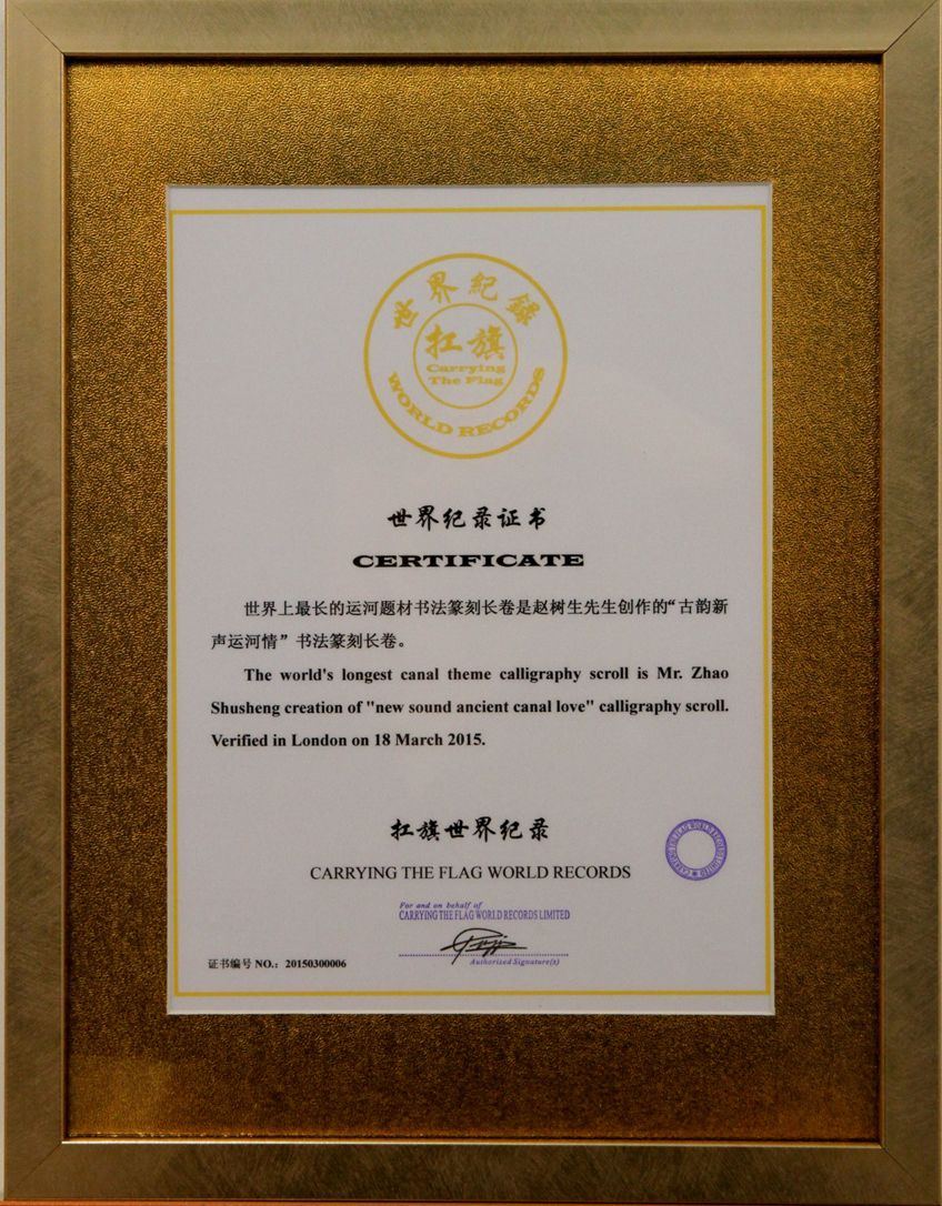 The world's longest canal theme calligraphy scroll is Mr. Zhao Shusheng creation of "new sound ancient canal love" calligraphy scroll. Verified in London on 18 March 2015.