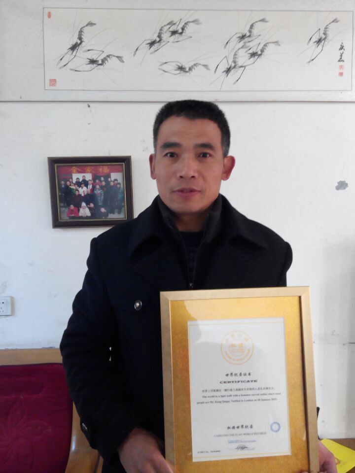 世界纪录名称:        世界上用铁锤在一颗灯泡上刻最多生肖图的人是孔庆泗先生。