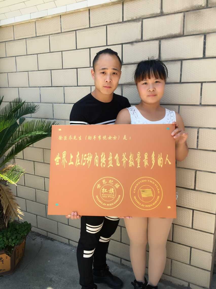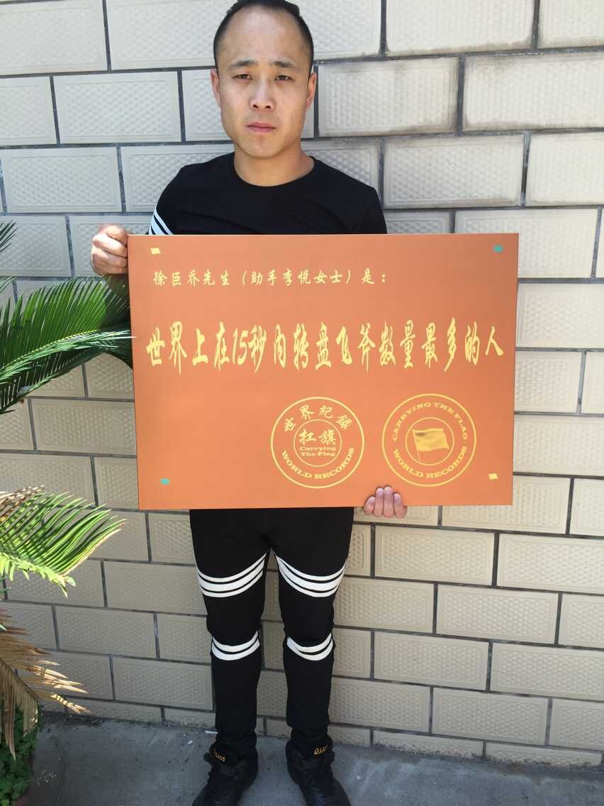 世界上在15秒内转盘飞斧数量最多的人是徐巨乔先生(助手李悦女士)。