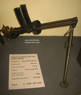 世界上最早的冲锋枪是维勒·帕洛沙“冲锋枪”。到了1915年5月23日,意大利加入协约国的一方而向奥匈帝国宣战。阿尔卑斯山的卡尔尼克和朱利安地区的山形地带提供了理想的防御环境,结果虽然意军兵力大大超过奥军,但地形却是对防御一方的奥军有利。那一年从6月到12月间一系列毫无建树的进攻行动当中,意军的损失就超过了两万七千八百多人。当时意大利人想到,要是有一种能够供单兵携带和发射的轻机枪就好了。于是一种单人携带、手枪弹的“冲锋枪”在1915年的年底(大概是在12月左右)被意大利军队采用。它就是维勒·帕洛沙Mod.1915(Villar Perosa),或简称为“V.P.”。