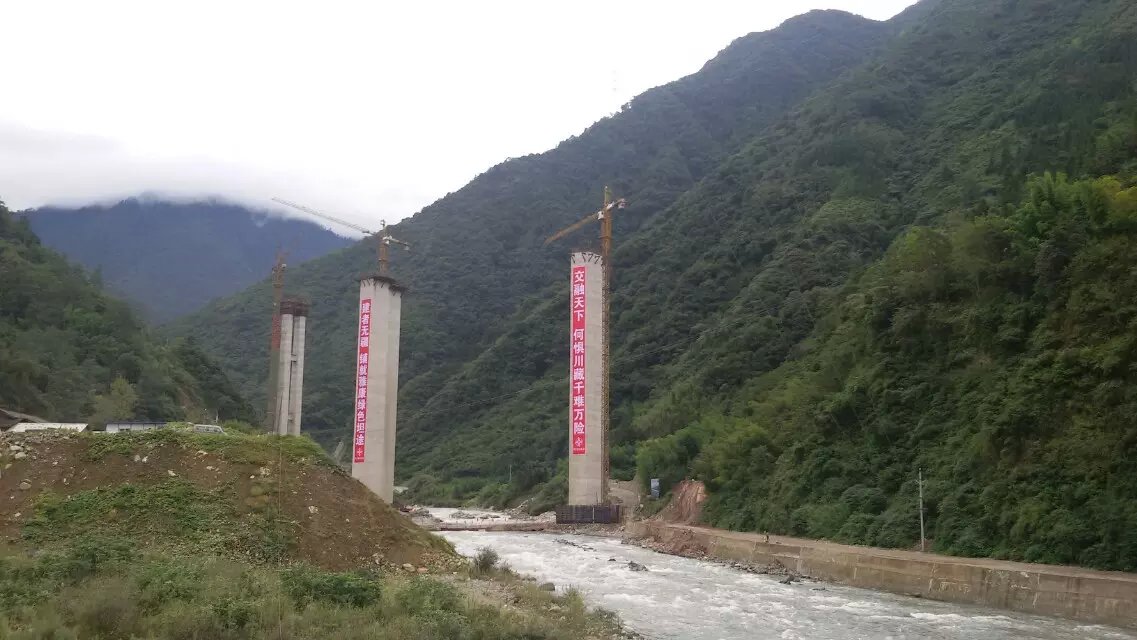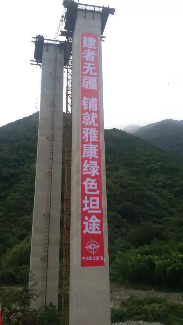 世界纪录保持者:     中交第四公路工程局有限公司张贴在雅康高速公路桥墩上的对联。