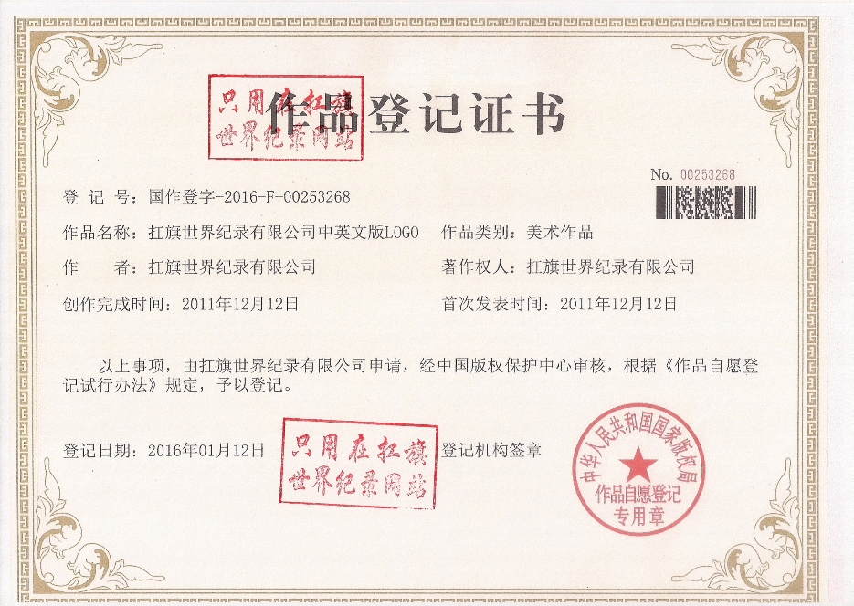扛旗世界纪录的标志不单进行了商标保护,更进行了版权保护,扛旗世界纪录拥有商标权、名称权、版权,未经授权,不得擅自使用扛旗世界纪录的标志,故意窜改、侮辱扛旗世界纪录标志的,扛旗世界纪录将依法起诉。