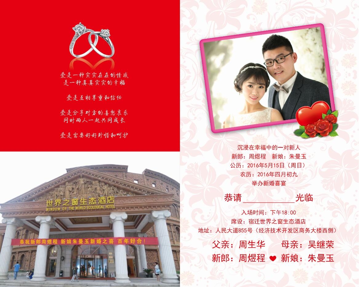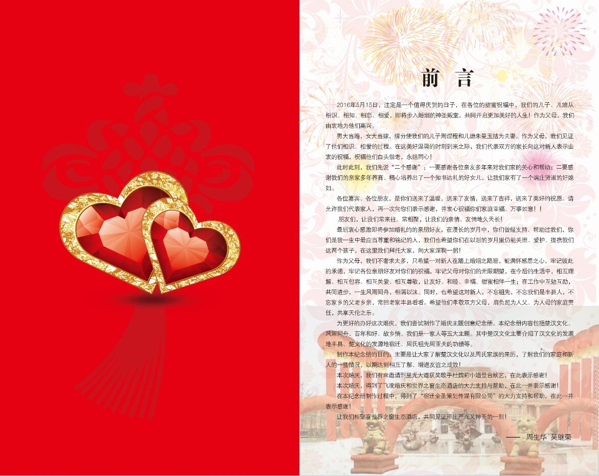 江苏宿迁周生华先生、吴继荣女士策划制作的周煜程、朱曼玉婚庆请柬纪念册申报成功案例:世界上首创的婚庆请柬纪念册(点击数: )