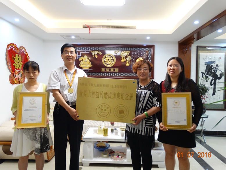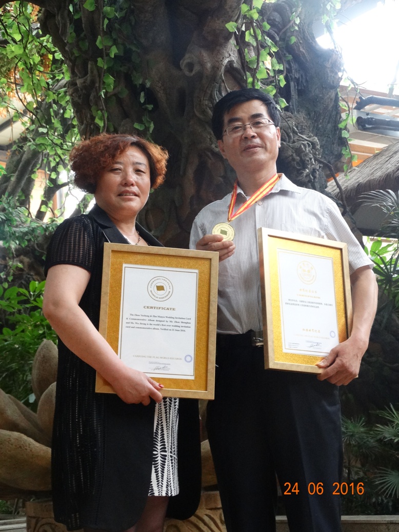世界纪录名称:        周生华先生、吴继荣女士策划制作的周煜程、朱曼玉婚庆请柬纪念册是世界上首创的婚庆请柬纪念册。