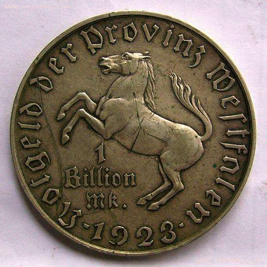 一战后,德国因在战争中失败并赔偿协约国巨额赔款,由此引起全国通货恶性膨胀。政府为应付国家开支、不断发行面值越来越大的货币。1921年至1923年,威斯特法伦省发行了一套非常有名的通涨币,全套23枚。其中面值最大的为“1 BILLION马克”即10亿马克。因这套硬币中的正面图案都是前足跃起的奔马,故此套币俗称马币。