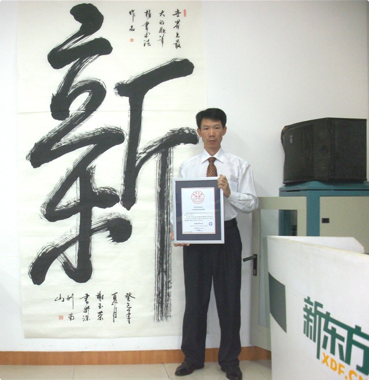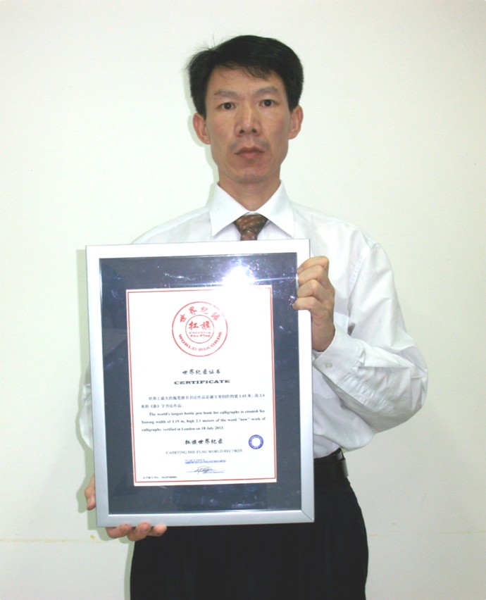 The world's largest bottle pen book list calligraphy is created Xie Yurong width of 1.15 m, high 2.1 meters of the word "new" work of calligraphy. verified in London on 18 July 2013.