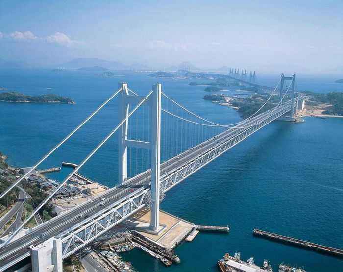 明石海峡大桥建于1998年,坐落于日本神户市与淡路岛之间,全长3911米,两座主桥墩高297米,主桥墩跨度长达1990米,是世界上跨度最大的桥。也是世界上最长的悬索桥。