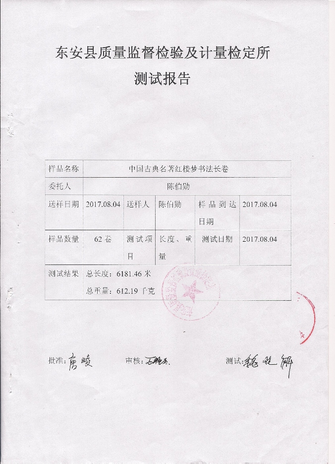 世界纪录名称:         陈伯勋先生创作的《红楼梦》行楷书法长卷是世界上长度最长的《红楼梦》行楷书法长卷。