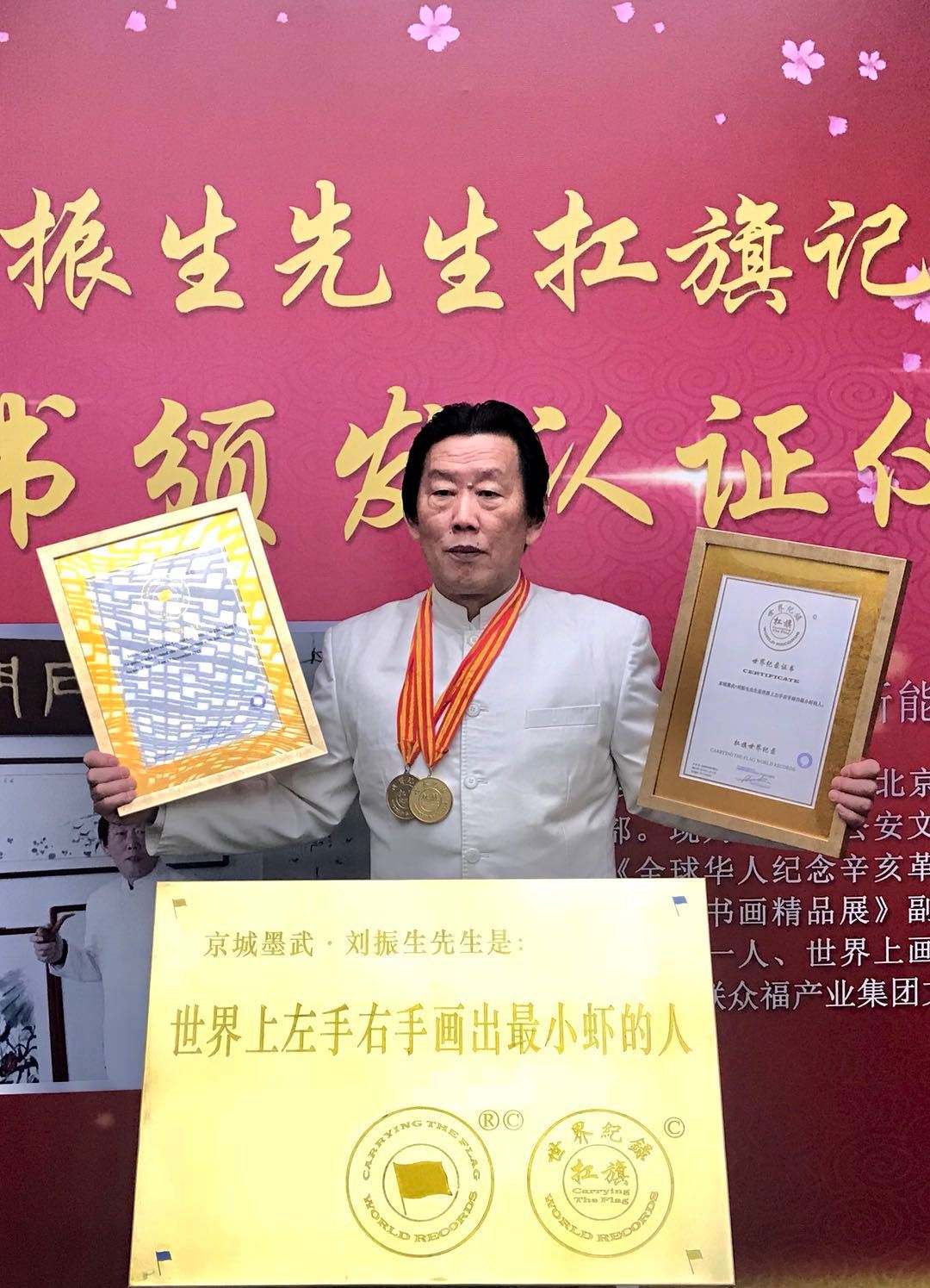 世界纪录名称:        京城墨武•刘振生先生是世界上左手右手画出最小虾的人。