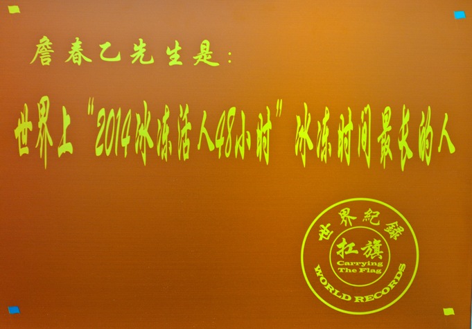 世界纪录名称:       世界上“2014冰冻活人48小时”冰冻时间最长的人是詹春乙先生。