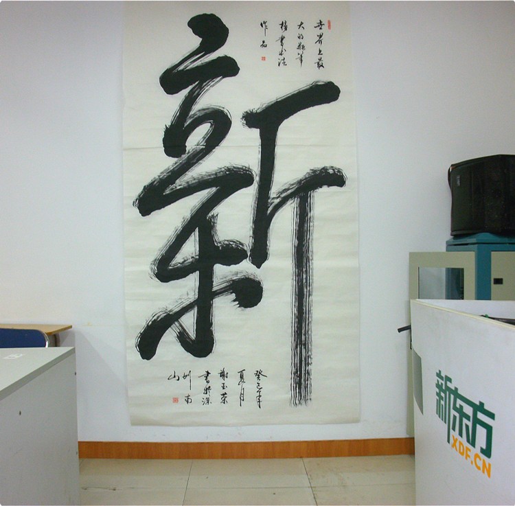 答:世界上最大的瓶笔榜书书法作品是谢玉荣创作的宽1.15米、高2.1米的《新》字书法作品