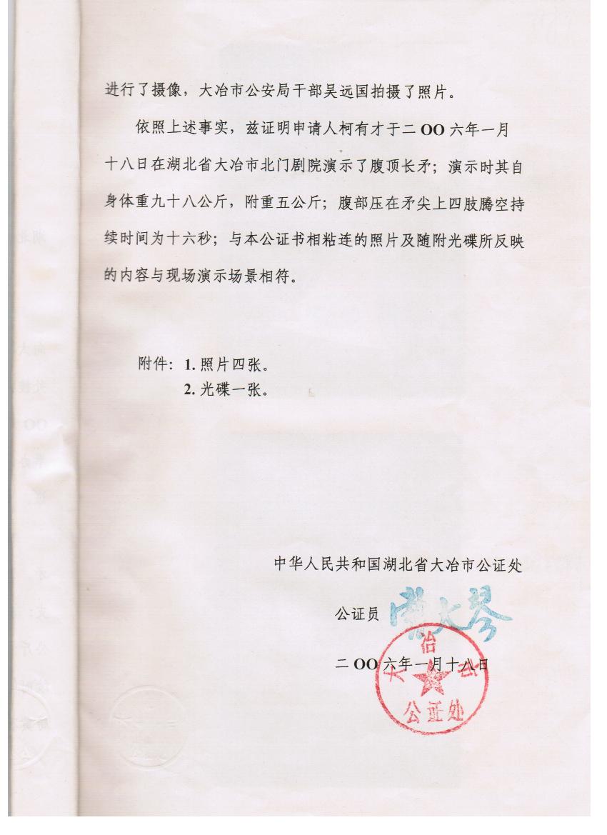 世界纪录规则:       1、世界上长矛顶腹旋转时间最长。体重98公斤,负重5公斤,时间16秒。本世界纪录初创者和保持者是柯友才先生。