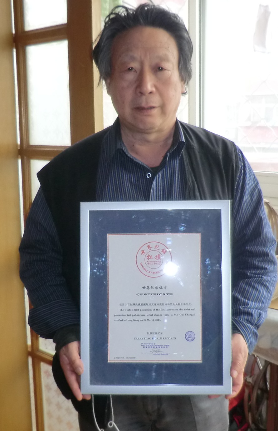 世界纪录名称:        世界上首创藏头藏腰藏尾回文连环变化诗体的人是崔长喜先生。