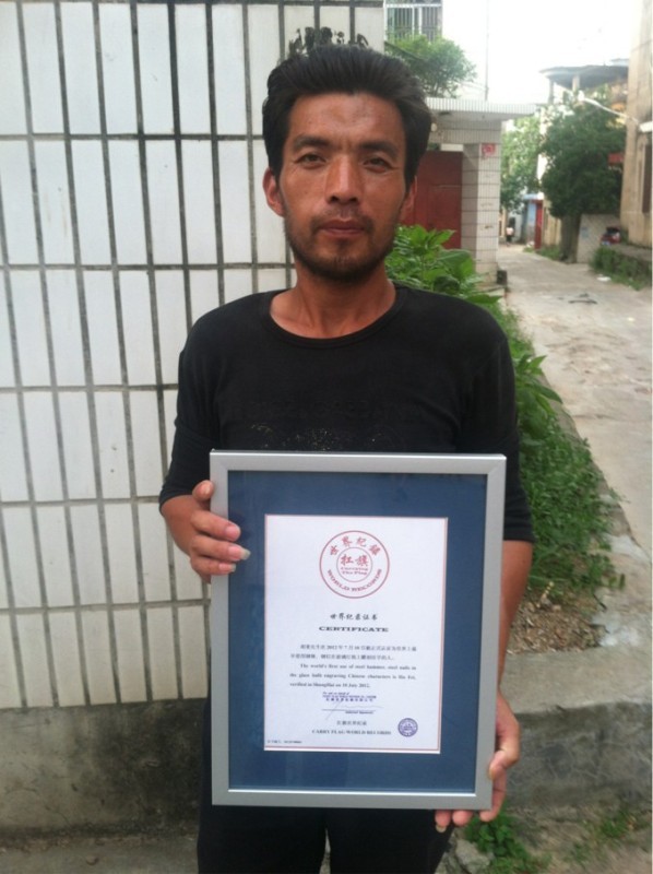 胡斐在2012年7月10日被正式认证为世界上最早使用钢锤、钢钉在玻璃灯泡上雕刻汉字的人。