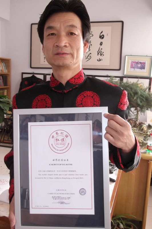 世界纪录名称:       世界上最大的瓶笔是李一浩先生发明的不锈钢瓶笔。