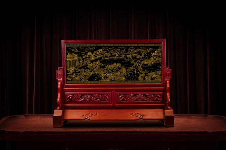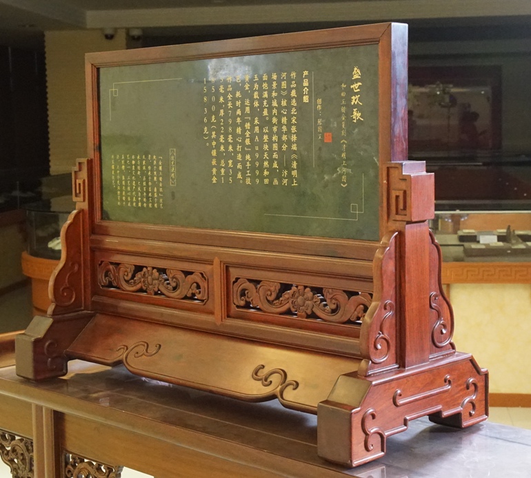 华昌珠宝有限公司张国王先生制作的《清明上河图》(部分)金镶玉错金银摆件是世界上面积最大的金镶玉错金银摆件。