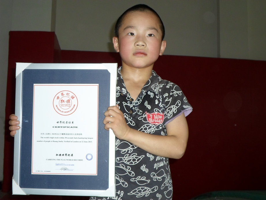 The world's high stools within 30 seconds back handspring largest number of people is Huang Junfu. Verified in London on 12 June 2013.