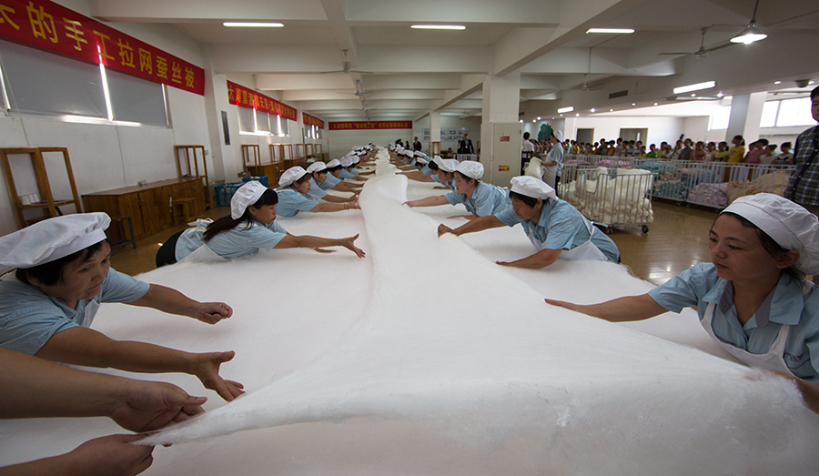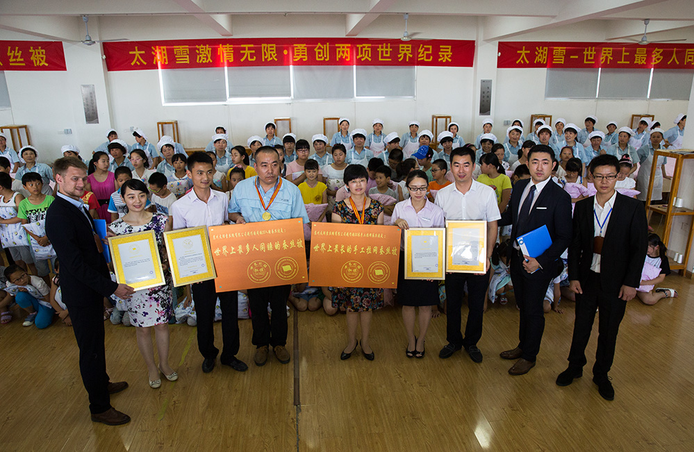 世界纪录保持者:   苏州太湖雪丝绸有限公司制作的30米手工拉网蚕丝被。