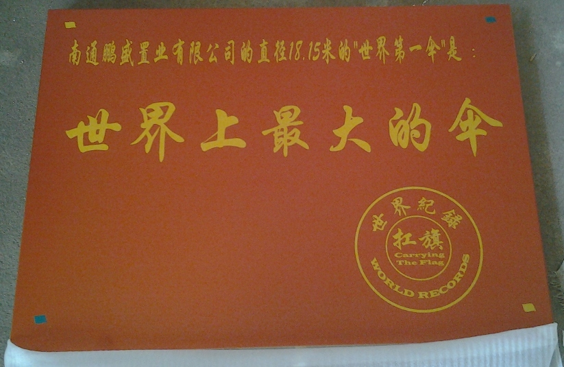 世界纪录保持者:   南通鹏盛置业有限公司的直径18.15米的“世界第一伞”。