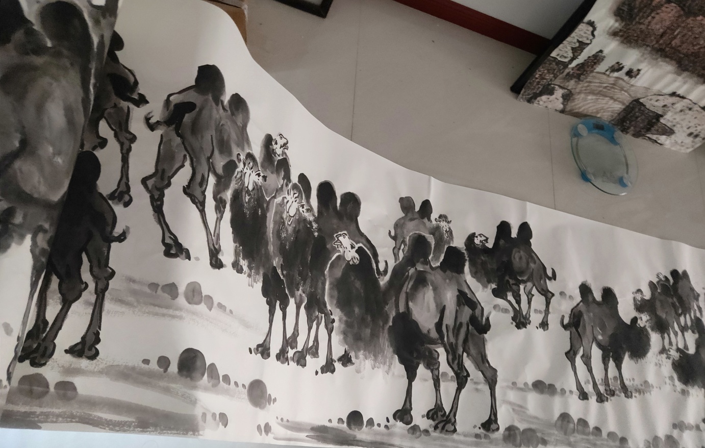 葛立才先生创作的《丝绸之路驼声起》是世界上最长的水墨骆驼画长卷。
