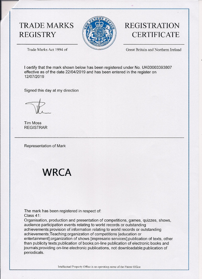 二、使用“WRCA”涉嫌侵犯英国CARRYING THE FLAG WORLD RECORDS LIMITED(扛旗世界纪录有限公司)第41类第UK00003393807号商标“WRCA” 商标专用权,侵权方包括所谓的申报者必被巨额索赔。尤其是使用号称是总部在英国的所谓的“证书”上带“WRCA”字眼的。英国商标证见英国商标局网站链接: