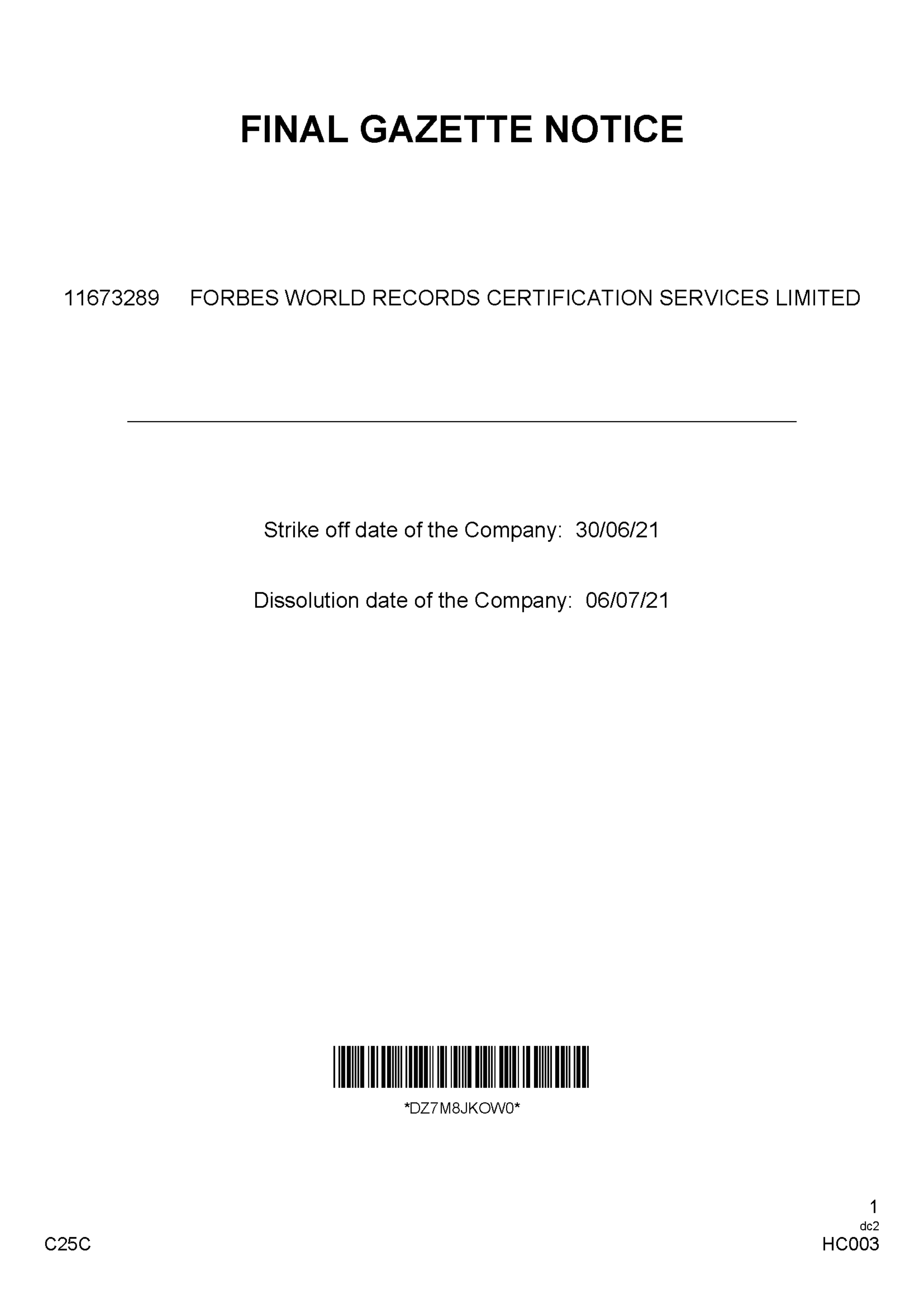 “FORBES WORLD RECORDS CERTIFICATION SERVICES LIMITED” 即所谓的“福布斯世界纪录认证服务有限公司”在2021年7月6日在英国 已被英国政府强制注销: