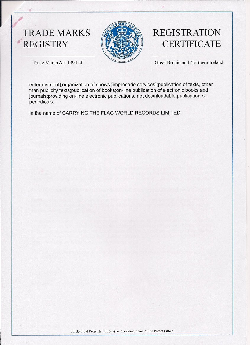二、 涉嫌侵犯侵犯英国CARRYING THE FLAG WORLD RECORDS LIMITED(扛旗世界纪录有限公司):第41类“第UK00003393810号商标“