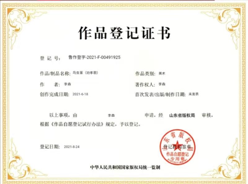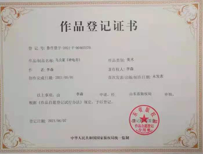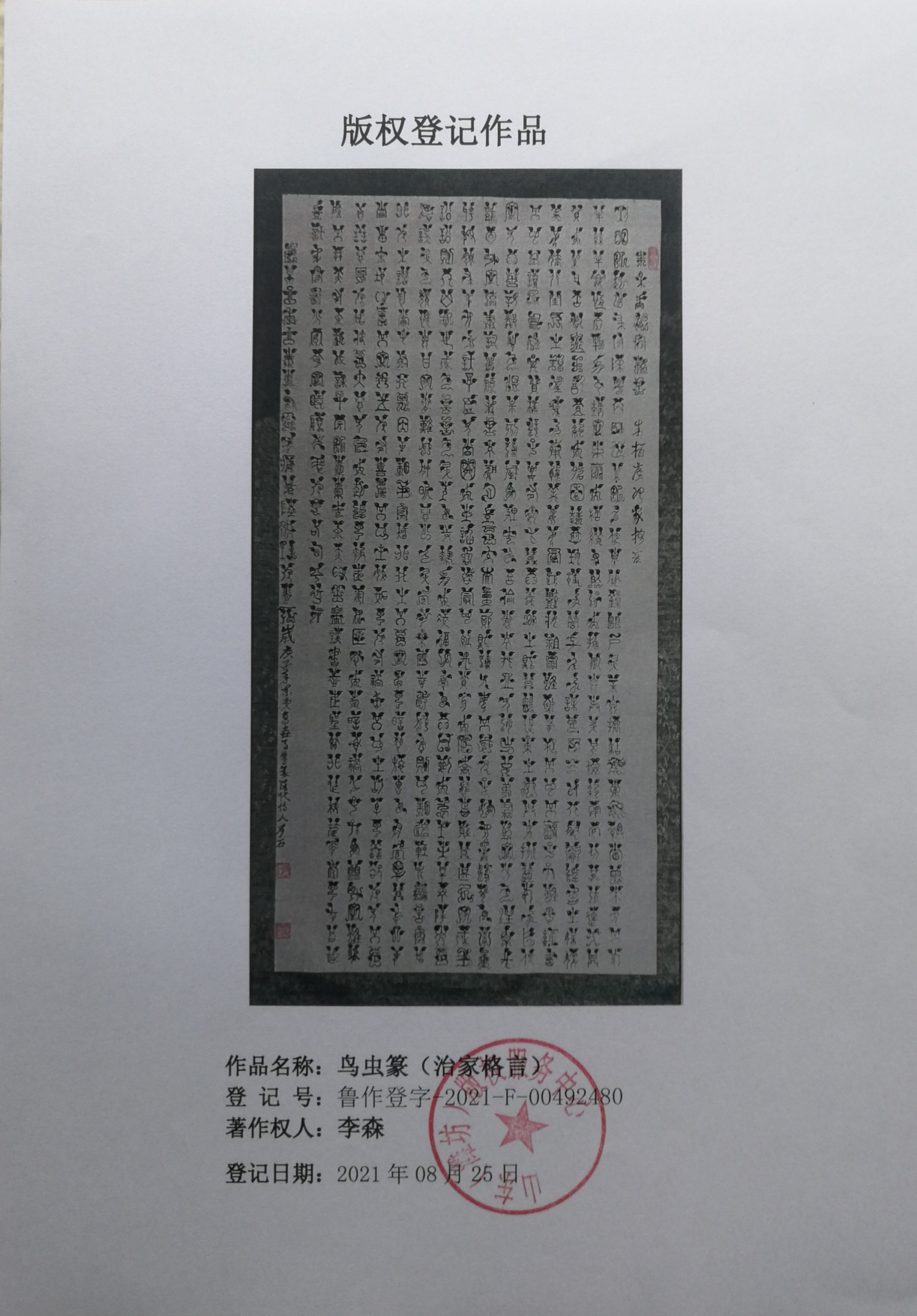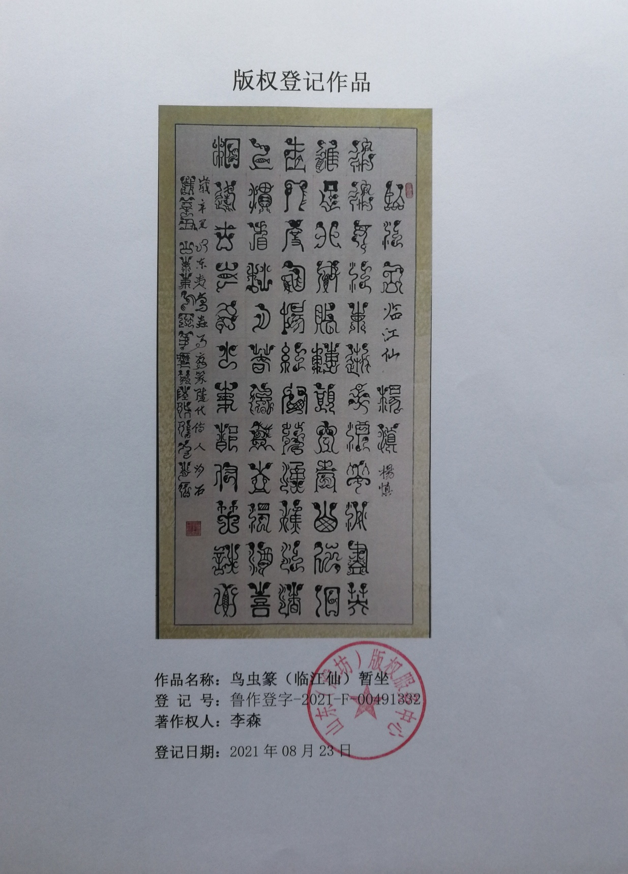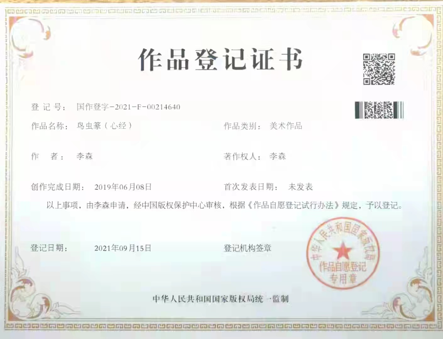 李森先生是世界上拥有鸟虫篆著作权《作品登记证书》数量最多的人。