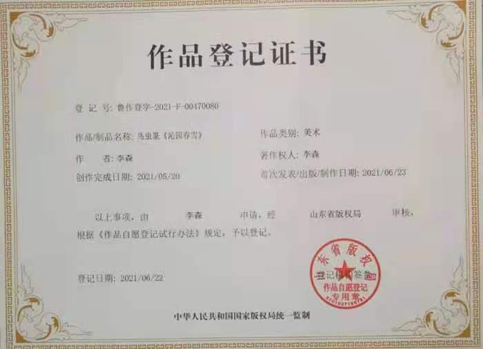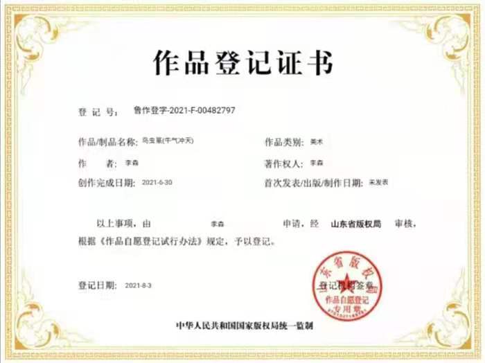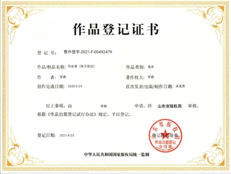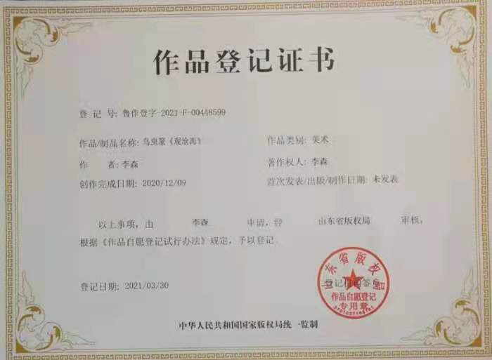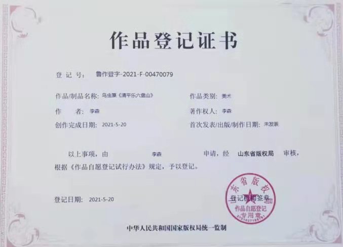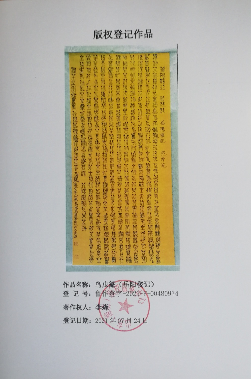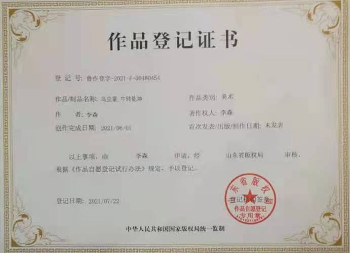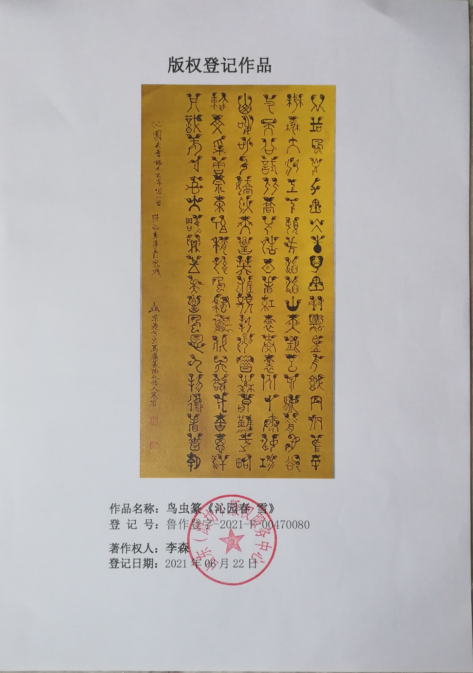 李森先生是世界上拥有鸟虫篆著作权《作品登记证书》数量最多的人。