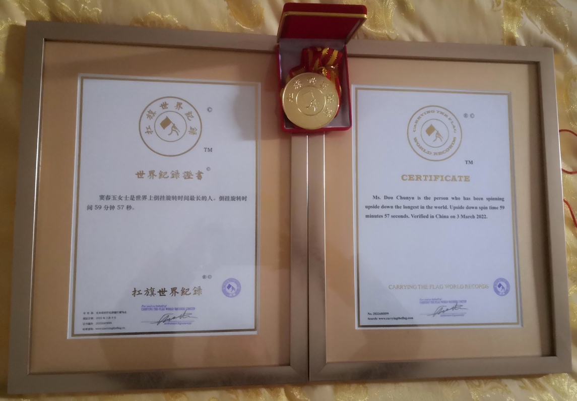 世界纪录名称:        窦春玉女士是世界上倒挂旋转时间最长的人。