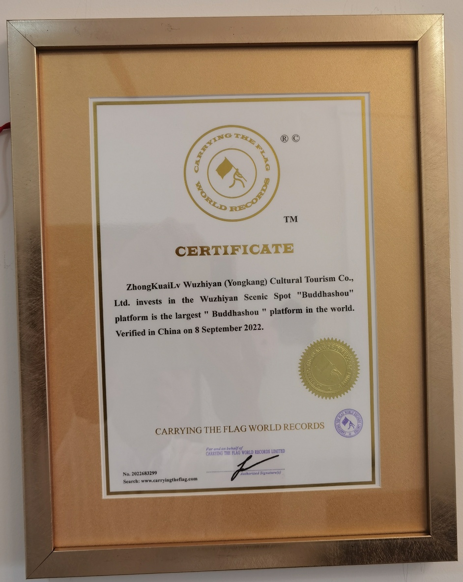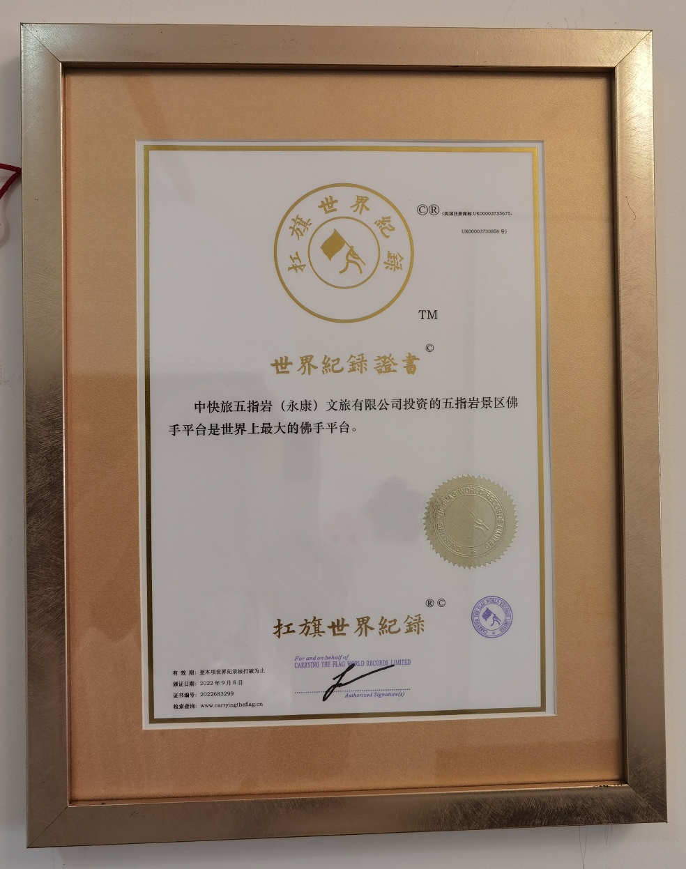 世界纪录名称:     中快旅五指岩(永康)文旅有限公司投资的五指岩景区佛手平台是世界上最大的佛手平台。