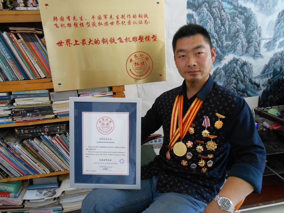 世界纪录保持者:    牛国军先生、韩国有先生制作的钢铁飞机雕塑模型