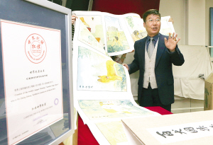 3 个月前张师傅发现了扛旗世界纪录,了解得知其总部设在英国伦敦,同样是一家世界纪录收录权威机构。他立即致电在中国的办事处咨询申报事宜,并按照要求开始 准备材料。“下载填写个人履历表,并提出所申请项目,”张师傅说,“先把这些通过邮件发给对方,经筛查未有重复申报后,一周后才通知我电邮申报材料。”为 此,他从婚庆公司请来摄像拍摄这本长册,自己又用一个下午统计画册中100条狗的花名册,产地、名称都得交代清楚。日前,由张师傅绘制的百犬图册,获得了 扛旗世界纪录的认证,被称为世界上创作长度最长的工笔画。