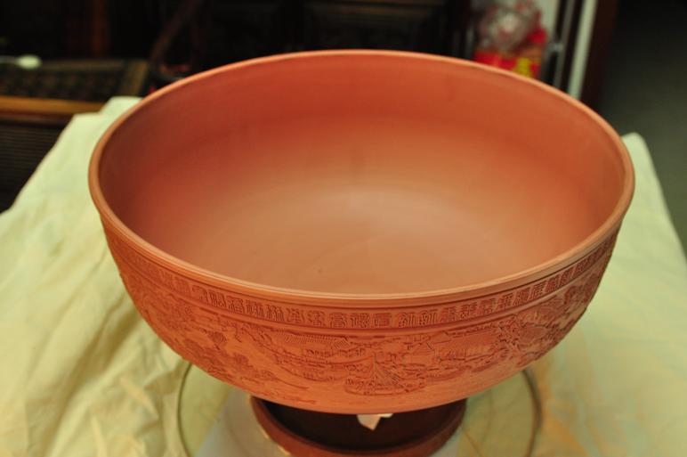 世界纪录名称:       世界上最大的紫砂碗是张小生、郑新顺先生、张嘉茜、邓永仙、许悠悠女士共同创作的最大外直径38.5厘米的紫砂碗。
