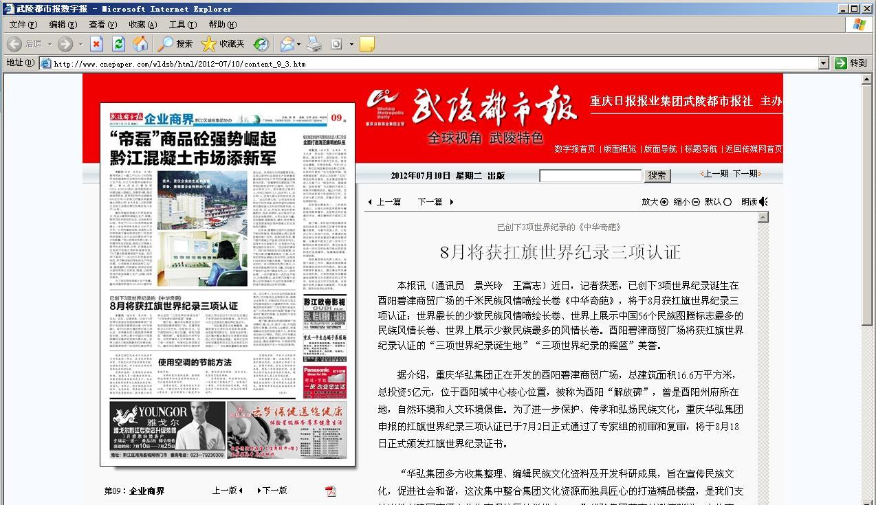 重庆华弘实业集团碧津商贸广场项目部谢德渊、王富志先生创作的《中华奇葩》喷绘长卷宽0.5米、长1120米、总面积560平方米,共展示中国56个民族图腾标志19488个和56个民族风情(其中少数民族55个),在2012年8月18日被扛旗世界纪录正式认证为世界上最长的少数民族风情喷绘长卷。重庆华弘实业集团开发建设的酉阳碧津商贸广场为此项世界纪录的诞生地、此项世界纪录的摇篮。