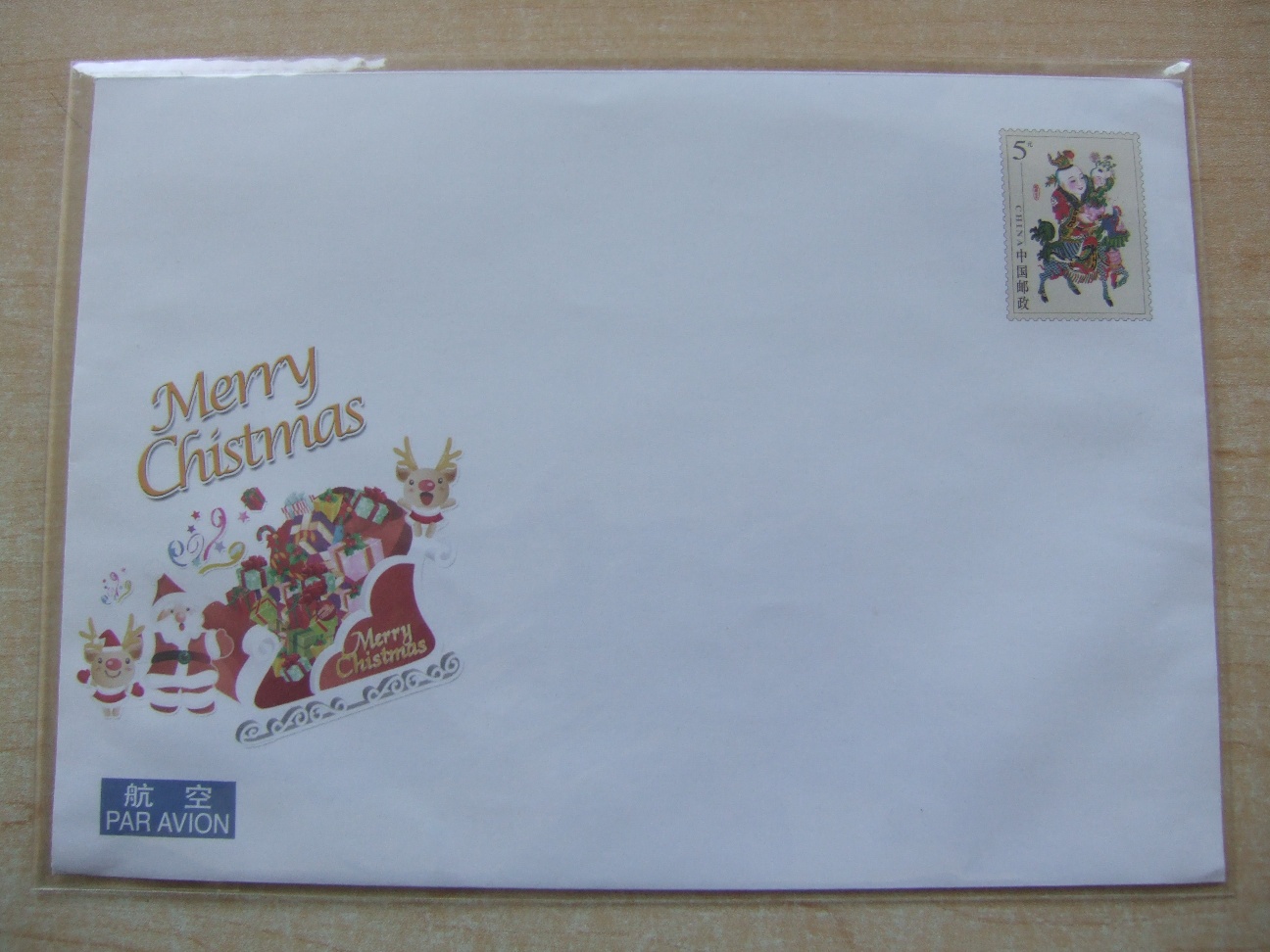 世界纪录规则:        错邮封。国际邮资特惠贺卡封邮资图为麒麟送子,封图是即为圣诞节图案国际特惠航空邮资封。圣诞节的英文为CHRISTMAS,设计者漏掉了R,因而成为世界上官方发行错误最大的邮品。此错封主图为英文CHISTMAS(漏写“R")和圣诞老人,驯鹿,载满礼物的雪橇,航空标志,邮资图为杨柳青年画--麒麟送子,信封规格:229×162mm,错字图面积为:80×75mm,背面落款国家邮政局发行(2005),发行编号08-370831-12-0002-000,三处MERRY CHRISTMAS全部漏写R。