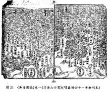 《筹海图编》共13卷,系1556年(明嘉靖三十五年)胡宗宪总督浙江军务时,为防御倭寇,聘请郑若曾等人收集海防有关资料编辑而成的一部沿海军事图籍,初刻于1562年(嘉靖四十一年)。《筹海图编》中的“沿海山沙图”,是迄今所能见到的最早、内容详备而又完整的海防军事地形图。